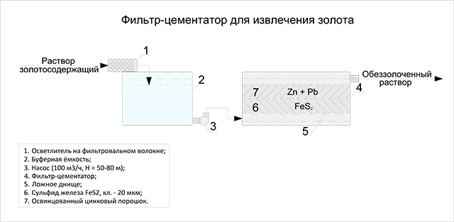 Фильтр может работать в двух вариантах, как сорбционный на активированном угле размером менее 40 микрон или, как фильтр – цементатор на цинковом порошке.
