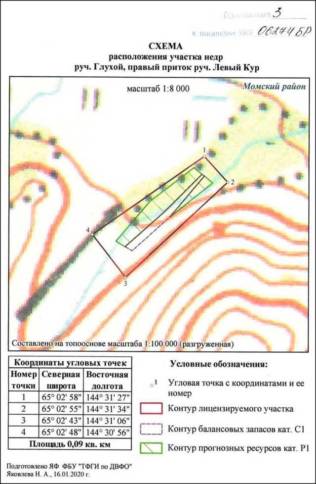 Кроме того, в 2023 г. была получена Лицензия на предоставление права пользования участками недр для геологического изучения недр, включающего поиски и оценку месторождений полезных ископаемых (россыпного золота) на участке недр руч. Глухой, правый приток Левый Кур (участок №2) на территории МО «Момский район».