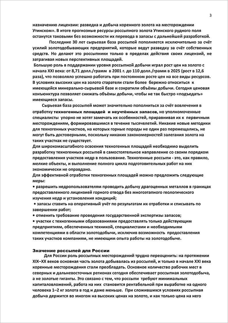Учитывая вышесказанное, требуется до конца 2025 года принять решение о работе россыпных предприятий на техногенных россыпях в 2026 году. Пришло время кардинальных решений — временные половинчатые меры не решают проблем широкомасштабного вовлечения в отработку техногенных россыпей.