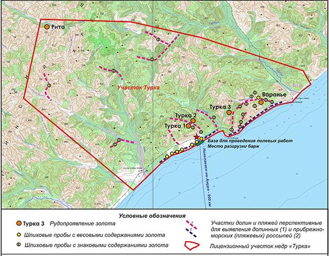 В результате проведенных работ в пределах лицензионной площади выявлены и изучены рудопроявления золота: Турка 1, Турка 2, Турка 3, Баранье в междуречье Мана-Гырбы, Рита в бассейне р. Кальби, правого притока р. Улья, и установлена золотоносность аллювиальных отложений, отложений прибрежно-морского пляжа (см. рис.2).