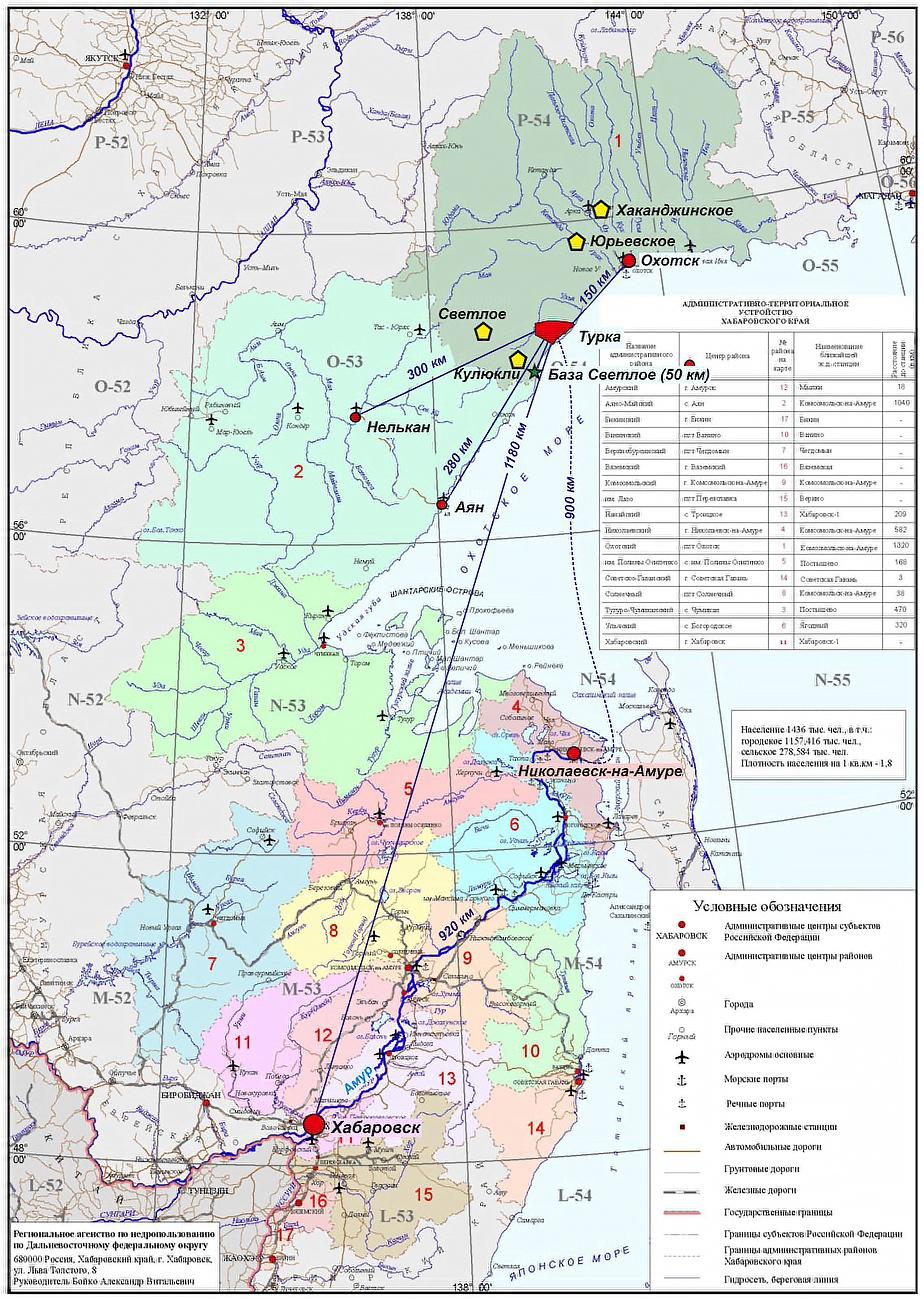 Ближайшие населенные пункты — поселок городского типа Охотск и база Светлое — расположены, соответственно, в 160 км к северо-востоку и 50 км к юго-западу от лицензионной площади (см. рис. 2).