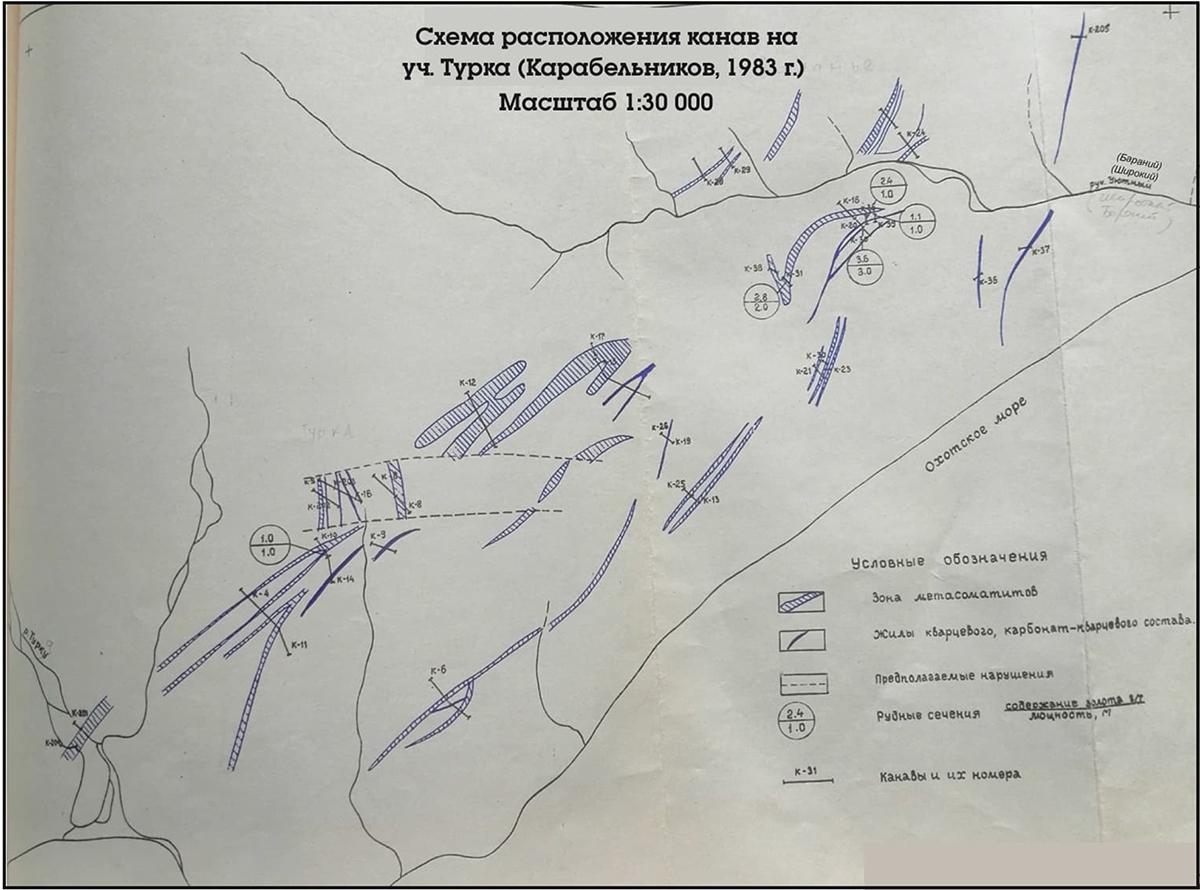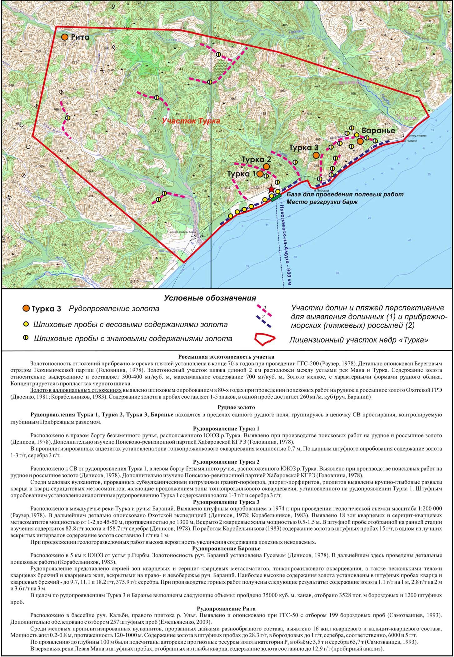 Россыпная золотоносность участка. Золотоносность отложений прибрежно-морских пляжей установлена в конце 70-х годов при проведении ГГС-200 (Раузер, 1978). Детально опоискован Береговым отрядом Геохимической партии (Головнина, 1978). Золотоносный участок пляжа длиной 2 км расположен между устьями рек Мана и Турка. Содержание золота относительно выдержанное и составляет 300–400 мг/куб. м, максимальное содержание 700 мг/куб. м. Золото мелкое, с характерными формами рудного облика. Концентрируется в пропластках черного шлиха. Золото в аллювиальных отложениях выявлено шлиховым опробованием в 80-х годах при проведении поисковых работ на рудное и россыпное золото Охотской ГРЭ (Двоенко, 1981; Корабельников, 1983). Содержание золота в пробах составляет 1–5 знаков, в одной пробе достигает 260 мг/м. куб (руч. Бараний).Рудное золото. Рудопроявления Турка 1, Турка 2, Турка 3, Баранье находятся в пределах единого рудного поля, группируясь в цепочку СВ простирания, контролируемую глубинным Прибрежным разломом.Рудопроявление Турка 1. Расположено в правом борту безымянного ручья, расположенного ЮЮЗ р. Турка. Выявлено при производстве поисковых работ на рудное и россыпное золото (Денисов, 1978). Дополнительно изучено Поисково-ревизионной партией Хабаровской КГРЭ (Головнина, 1978). В пропилитизированных андезитах установлена зона тонкопрожилкового окварцевания мощностью 0,7 м. По данным штуфного опробования содержание золота 1–3 г/т, серебра 3 г/т.Рудопроявление Турка 2. Расположено к СВ от рудопроявления Турка 1, в левом борту безымянного ручья, расположенного ЮЮЗ р. Турка. Выявлено при производстве поисковых работ на рудное и россыпное золото (Денисов, 1978). Дополнительно изучено Поисково-ревизионной партией Хабаровской КГРЭ (Головнина, 1978). Среди меловых вулканитов, прорванных субвулканическими интрузиями гранит-порфиров, диорит-порфиритов, риолитов выявлены крупно-глыбовые развалы кварца и кварц-серицитовых метасоматитов, являющие продолжением зоны тонкопрожилкового окварцевания, установленного на рудопроявлении Турка 1. Штуфным опробованием установлены аналогичные рудопроявлению Турка 1 содержания золота 1–3 г/т и серебра 3 г/т.Рудопроявление Турка 3. Расположено в междуречье реки Турка и ручья Бараний. Выявлено штуфным опробованием в 1974 г. при проведении геологической съемки масштаба 1:200 000 (Раузер, 1978). В дальнейшем детально опоисковано Охотской экспедицией (Денисов, 1978; Корабельников, 1983). Выявлено 18 зон кварцевых и серицит-кварцевых метасоматитов мощностью от 1–2 до 45–50 м, протяженностью до 1300 м. Вскрыто 2 кварцевые жилы мощностью 0,5–1,5 м. В штуфной пробе, отобранной на ранней стадии изучения, содержится 82,8 г/т золота и 458,7 г/т серебра (Денисов, 1978). По работам Корабельникова (1983) содержание золота в штуфных пробах 15 г/т, в одном из лучших вскрытых интервалов содержание золота составило 1 г/т на 1 м. При продолжении геологоразведочных работ высока вероятность увеличения содержания полезных ископаемых.Рудопроявление Баранье. Расположено в 5 км к ЮЮЗ от устья р. Гырбы. Золотоносность руч. Бараний установлена Гусевым (Денисов, 1978). В дальнейшем здесь проведены детальные поисковые работы (Корабельников, 1983). Рудопроявление представлено серией зон кварцевых и серицит-кварцевых метасоматитов, тонкопрожилкового окварцевания, а также несколькими телами кварцевых брекчи