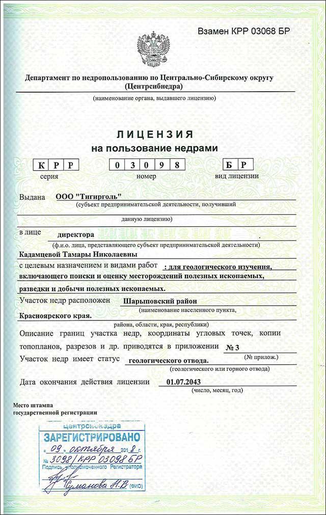 Лицензия на пользование недрами серия КРР № 03098 вид БР.