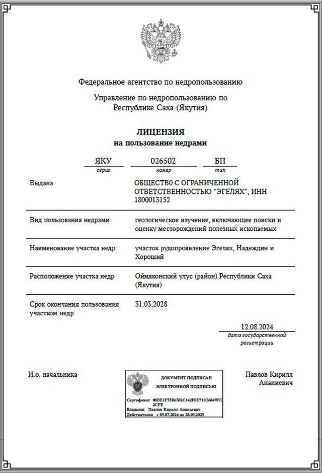Лицензионный участок «Эгелях, Надеждин, Хороший» расположен в пределах Бадранского рудного узла и обладает высоким потенциалом выявления промышленного месторождения рудного и россыпного золота.