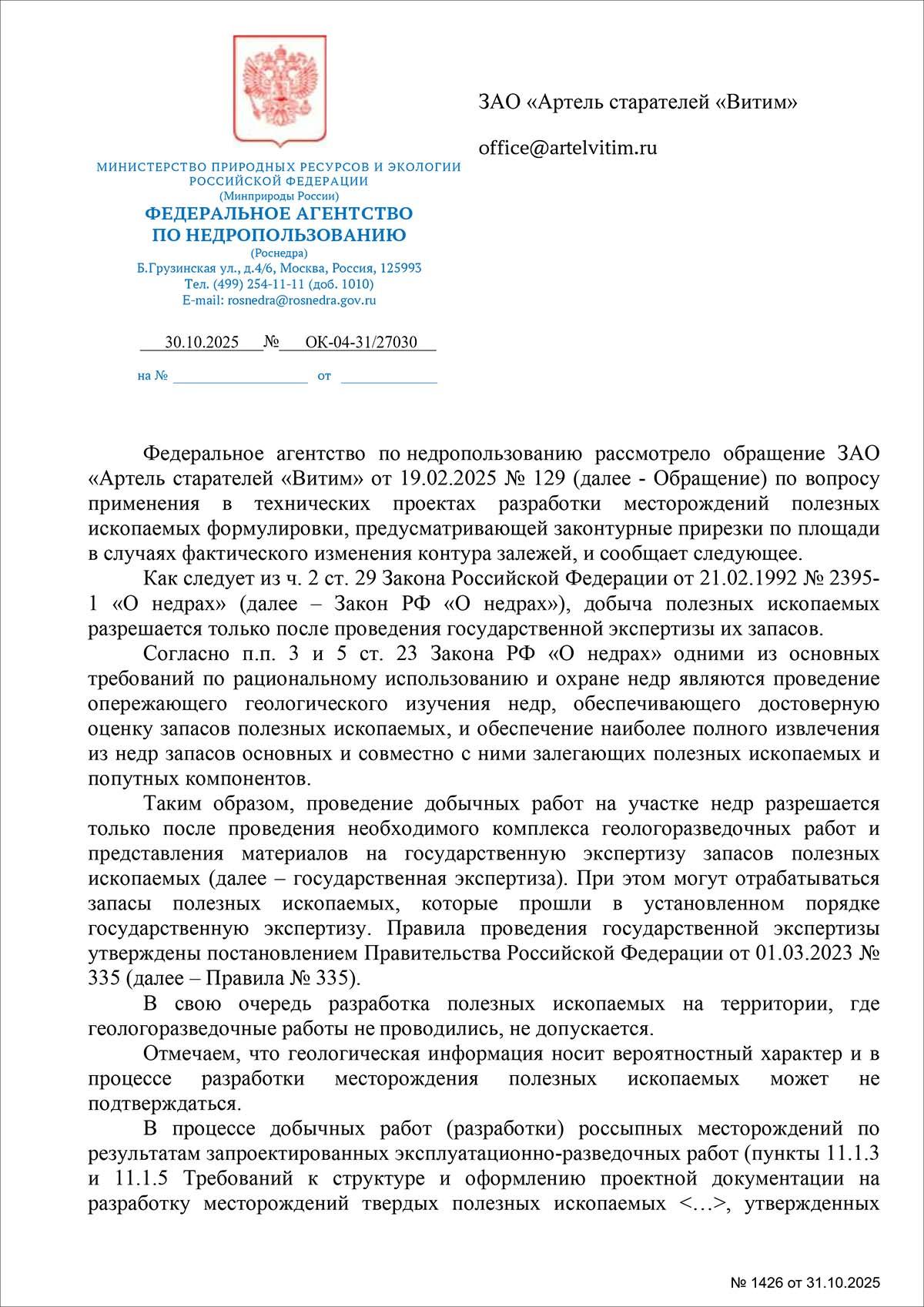 Федеральное агентство по недропользованию рассмотрело обращение ЗАО «Артель старателей «Витим» от 19.02.2025 № 129 (далее - Обращение) по вопросу применения в технических проектах разработки месторождений полезных ископаемых формулировки, предусматривающей законтурные прирезки по площади |