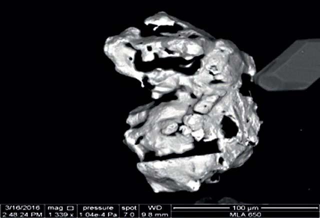 Месторождение Хлебопёк. Детализация форм одной из микрочастиц золота в коре выветривания. Увеличение 25-30 раз. Чётко видны формы роста и растворения |
